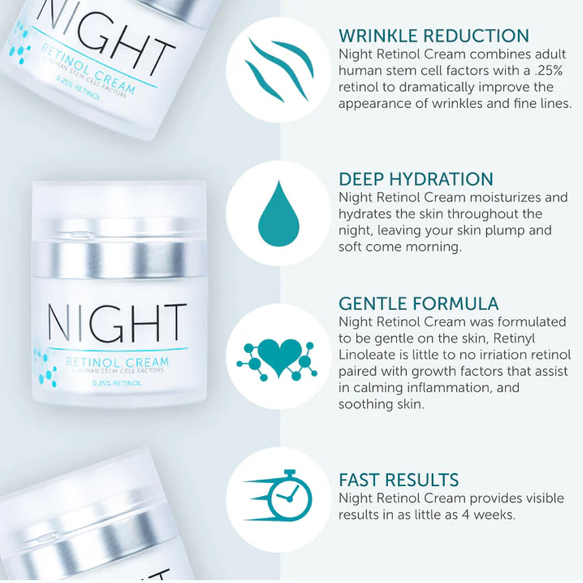 FactorFive Skincare Retinol Cream dramatically improves the appearance of wrinkles and fine lines with adult human stem cell factors with a 25% retinol for an overnight, at-home skin treatment. This advanced nighttime moisturizer helps to smooth, firm, and lift with a specialized retinoid that provides visible results.